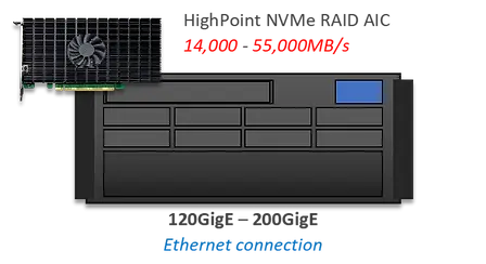 HighPoint manufactures the industry’s fastest external NVMe RAID solutions. This unique hardware architecture leverages intelligent PCIe switch technology to allocate up to x4 lanes of host bandwidth to each drive port, on the fly, to ensure maximum throughput for each NVMe SSD. Each external enclosure connects to the target server via a discreet PCIe AIC and robust, proprietary cabling solution designed to ensure x16 lanes of dedicated PCIe bandwidth are available at all times.