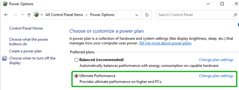3) Access Power Options under Control Panel > Hardware and Sound > Power Options. Change the power setting to Ultimate Performance or High Performance.