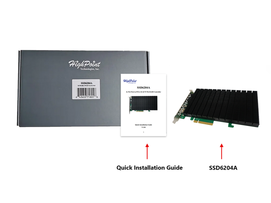 SSD6204A Driverless, Bootable 4x M.2 PCIe Gen3 x8 NVMe RAID Controller