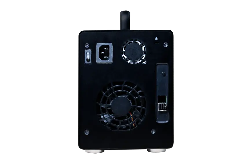 The most prominent feature of the enclosure’s front-panel is the configurable 16x2 backlit LCD screen. This LCD is an integral component of the enclosure’s cooling system, includes a selection of fan-related controls and reports ambient interior temperatures in real time. A bank of LED indicators actively monitors the status of hosted storage devices with simple yet highly-effective color-coding scheme; Yellow for warning, Red for failure or error, Green for Normal/Optimal.