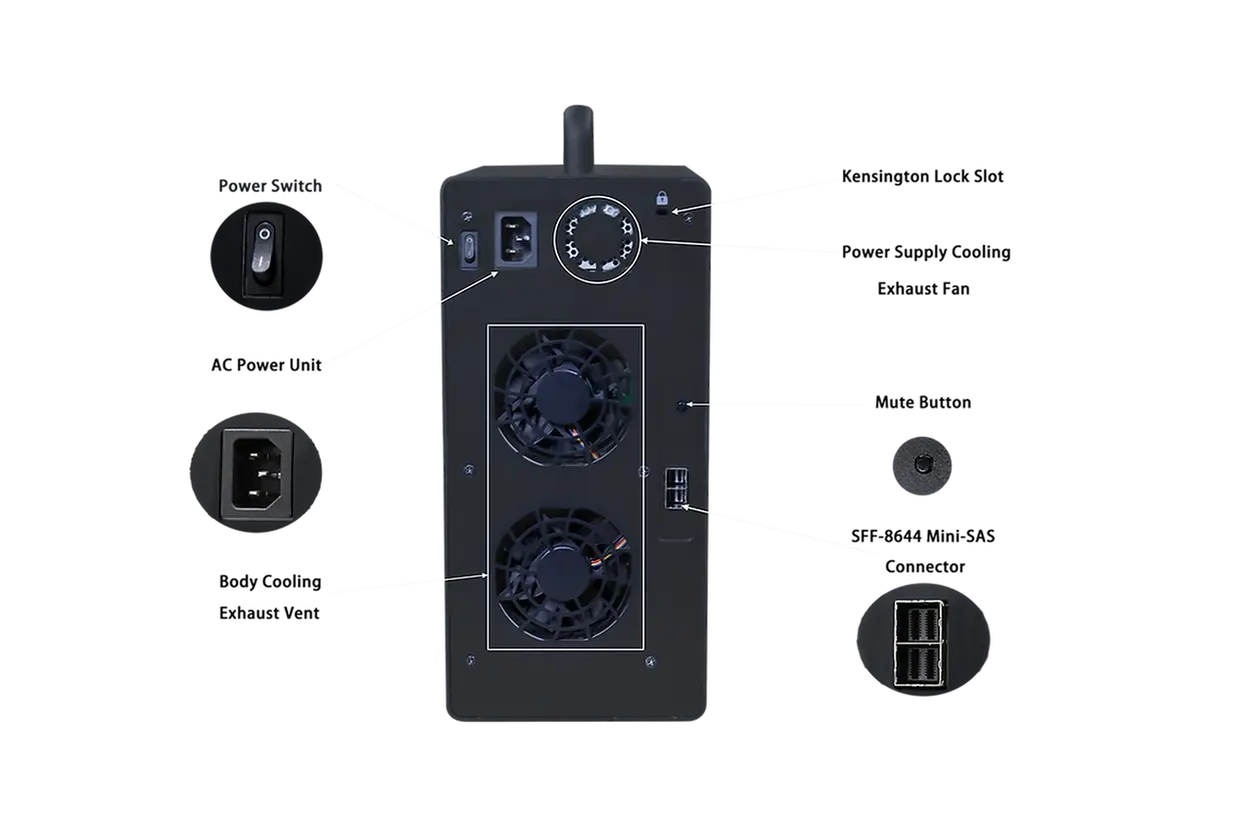 The most prominent feature of the enclosure’s front-panel is the configurable 16x2 backlit LCD screen. This LCD is an integral component of the enclosure’s cooling system, includes a selection of fan-related controls and reports ambient interior temperatures in real time. A bank of LED indicators actively monitors the status of hosted storage devices with simple yet highly-effective color-coding scheme; Yellow for warning, Red for failure or error, Green for Normal/Optimal.